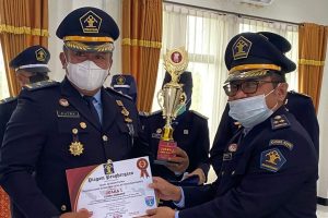 Bintan – Srikandinews.com. Kepala Kesatuan Pengamanan Lembaga Pemasyarakatan (Ka. KPLP) Faizal Gerhani Putra didampingi Anggota Pengamanan Felix Asnawi mewakili Lembaga Pemasyarakatan Narkotika Kelas IIA Tanjungpinang pada penerimaan gelar juara dalam perhelatan perlombaan peringatan HDKD Tahun 2021 di Linkungan Kanwil Kemenkumham Kepri. Senin, (01/11/2021).