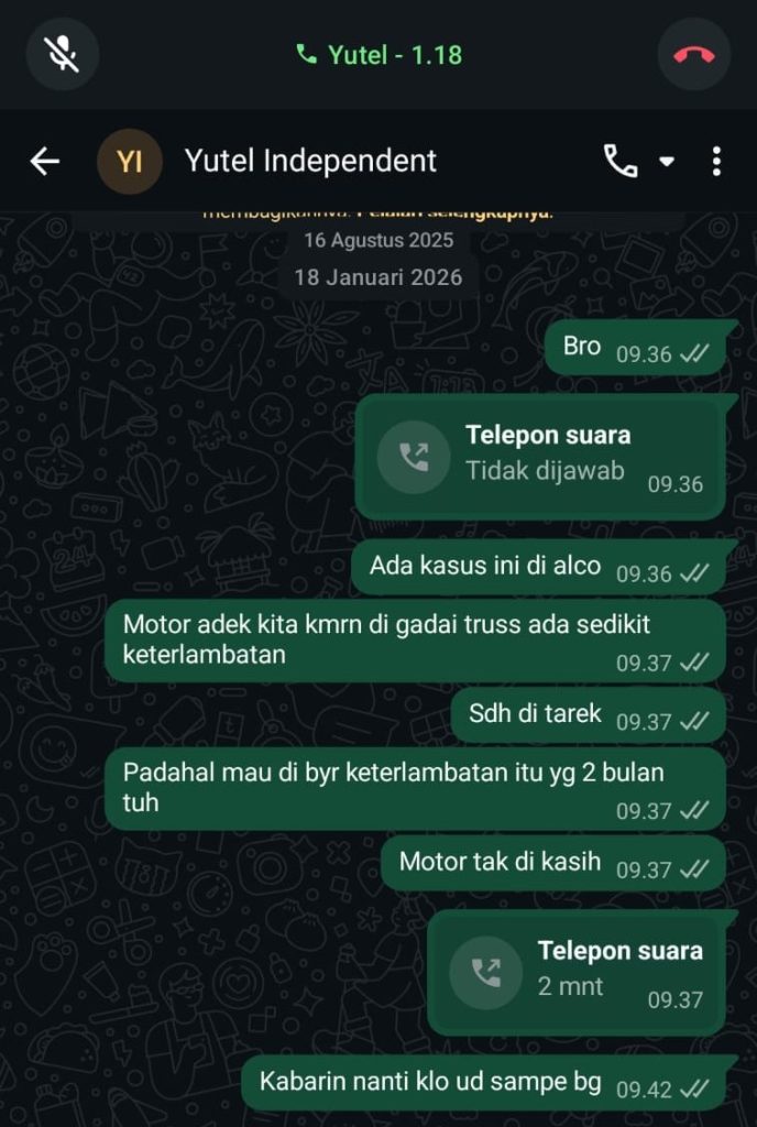 MG mengatakan, saya tdk pernah meminta loker samanya karena sayapun ada usaha ngapain saya minta kerjaan. Trus saya hanya memberikan dia kasus sama wartawan inisial YT ini agar di usut tuntas terkait penahanan motor adek saya di bulan 1 oleh leasing. “Ujarnya”